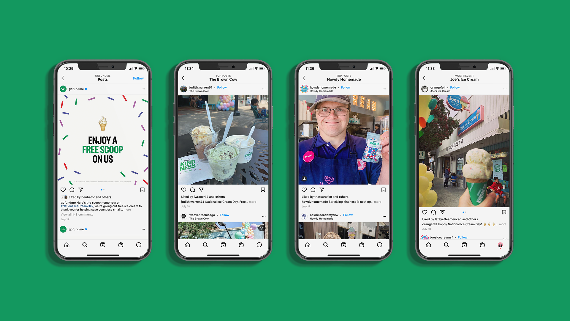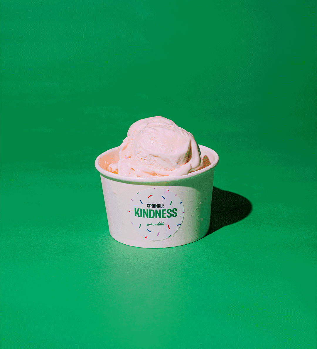 We celebrated this collective community kindness on National Ice Cream Day by giving out free scoops of a new ice cream flavor—Sprinkle Kindness—at five ice cream shops that had been saved by their local community on GoFundMe. The campaign had everything: napkins, posters, ice cream cone covers, sprinkles packets, and mural art.